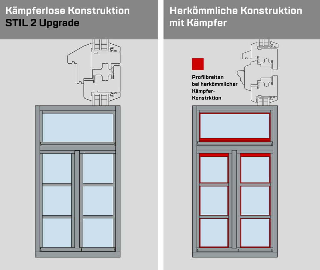 Die Ansichtsbreite des waagrechten Profils in Kämpfer-Bauweise ist deutlich breiter und wirkt deshalb wuchtiger (in der Abbildung ROT MARKIERT) und nicht mehr so filligran, wie bei der kämpferlosen Bauweise – dies geht natürlich auch sichtbar zu Lasten der lichten Glasflächen.
